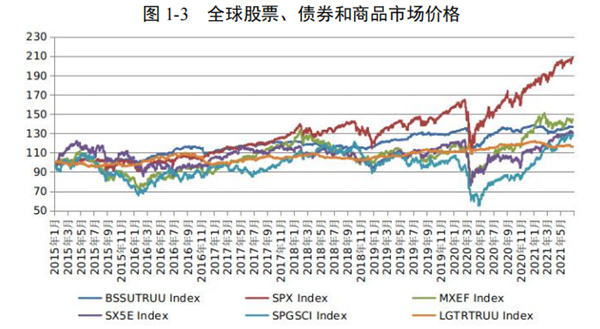 注:BSSUTRUU和LGTRTRUU分别为彭博巴克莱新兴市场和发达国家主权债券指数,MXEF为MSCI新兴市场股指,SPX为美国标准普尔500股指,SX5E为欧元区斯托克50股指,SPGSCI为标准普尔GSCI商品价格指数,均以2015年初值为100。
