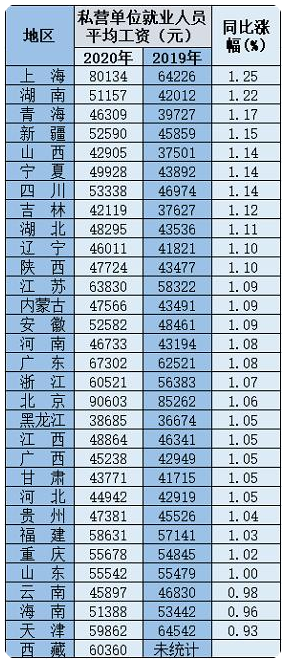 就平均工资来看,在非私营单位当中,北京、上海、西藏、天津、浙江、广东、江苏、青海等地区的平均工资超过了10万元,排名靠前。在私营单位当中,北京、上海、广东、江苏、浙江、西藏等6个地区的平均工资均超过了6万元,排名靠前。