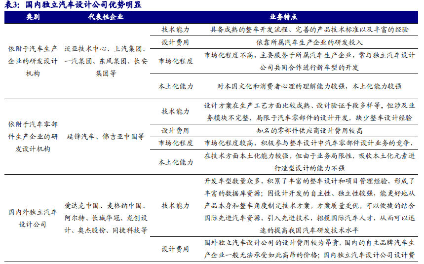 (3)国内外独立汽车设计公司,如爱达克中国、麦格纳中国、阿尔特、长城华冠、龙创设计、奥杰股份、同捷科技等。此类公司开发车型数量众多,积累了丰富的整车设计和项目管理经验,形成了丰富的数据库资源;设计开发的自主性、独立性较强,方案质量更优;国际先进汽车资源,引入先进技术,招揽国际汽车人才;设计费用方面,国外独立汽车设计公司的设计费用较为昂贵,国内的自主品牌汽车生产企业一般无法承受如此高昂的价格;国内独立汽车设计公司设计费用相对较低,设计性价比更高;独立汽车设计公司的机制更灵活,响应速度更快,为客户服务意识较强,市场化程度较高,客户覆盖所有汽车生产企业;国外独立汽车设计公司与国内汽车生产企业及消费者对汽车产品需求和理解存在一定偏差,其设计的车型不一定能够满足中国市场的消费需求;而国内独立汽车设计公司对汽车产品的理解与本国汽车生产企业和消费者较为一致,本土化能力较强.