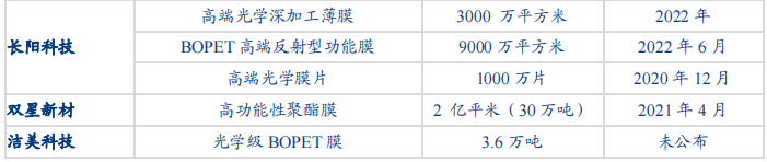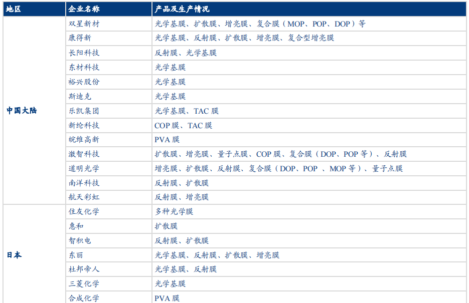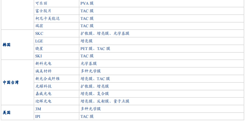 中国台湾光学膜主要生产企业有:新科光电、诚美材料、新光合成纤维、光耀科技、嘉威光电、迎辉光电等。