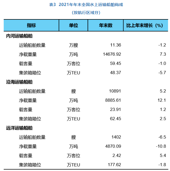 年末全国拥有水上运输船舶12.59万艘,比上年末下降0.7%,其中净载重量28432.63万吨、增长5.1%,载客量85.78万客位、下降0.3%,集装箱箱位288.43万标准箱、下降1.6%。