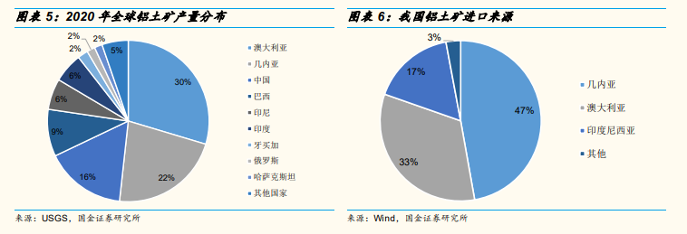 从数据显示中,我国铝土矿资产较为有限。在2020年全球铝土矿资源储量月有300亿吨。其中最多的是几内亚和澳大利亚。占比分别是25%和17%。而中国铝土矿资源占全球比重约为3%,排第七位。我国的铝土矿资源主要分布在广西、河南、贵州和山西等地,截止2017年末,上述四省份的铝土矿储量在全国的比重分别为49%、15%、14%和14%。