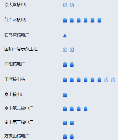 截止2022年3月31日,中国共有23座核电站(仅中国大陆),分别为:徐大堡核电厂、红沿河核电厂、石岛湾核电厂、国和一号示范工程、海阳核电厂、田湾核电站、秦山核电厂、秦山第二核电厂、秦山第三核电厂、方家山核电厂、三门核电厂、三澳核电厂、宁德核电厂、福清核电厂、漳州核电厂、太平岭核电厂、岭澳核电厂、大亚湾核电厂、台山核电厂、阳江核电厂、防城港核电厂、昌江核电厂、昌江小堆示范工程。