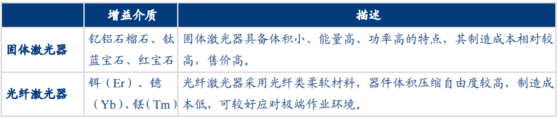 激光器是一种能发射激光的装置。从激光器的增益介质分类,可将其分为固体、光纤、半导体激光器。