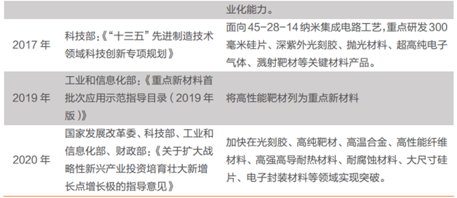 2020年,国家发展改革委、科技部、工业和信息化部、财政部《关于扩大战略性新兴产业投资培育壮大新增长点增长极的指导意见》,加快在光刻胶、高纯靶材、高温合金、高性能纤维材料、高强高导耐热材料、耐腐蚀材料、大尺寸硅片、电子封装材料等领域实现突破。