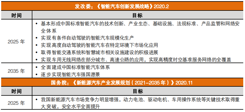 发改委、国务院在2020年先后印发了《智能汽车创新发展战略》和《新能源汽车产业发展规划(2021-2035 年)》。
