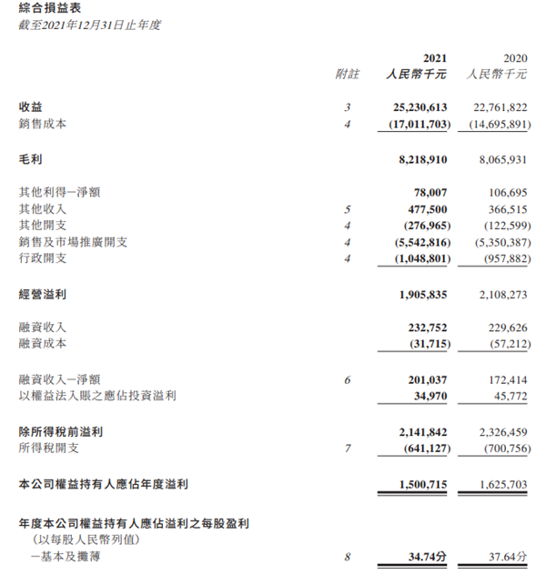 根据统一中国2021年末期业绩公告,2021年统一中国收益为人民币25,230.6百万元,较去年上升10.8%。