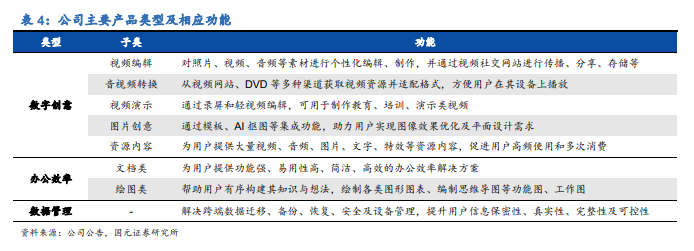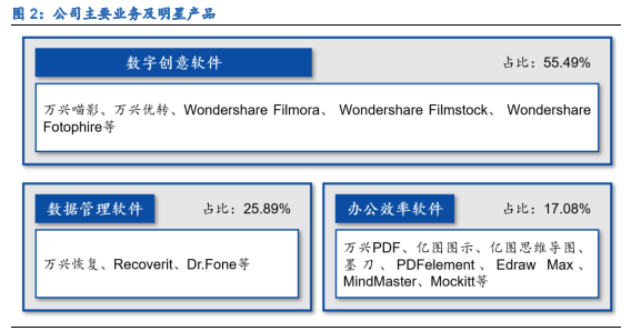 数字创意:产品有万兴喵影、万兴优转、Wondershare Filmora、Wondershare Filmstock、Wondershare Fotophire等
