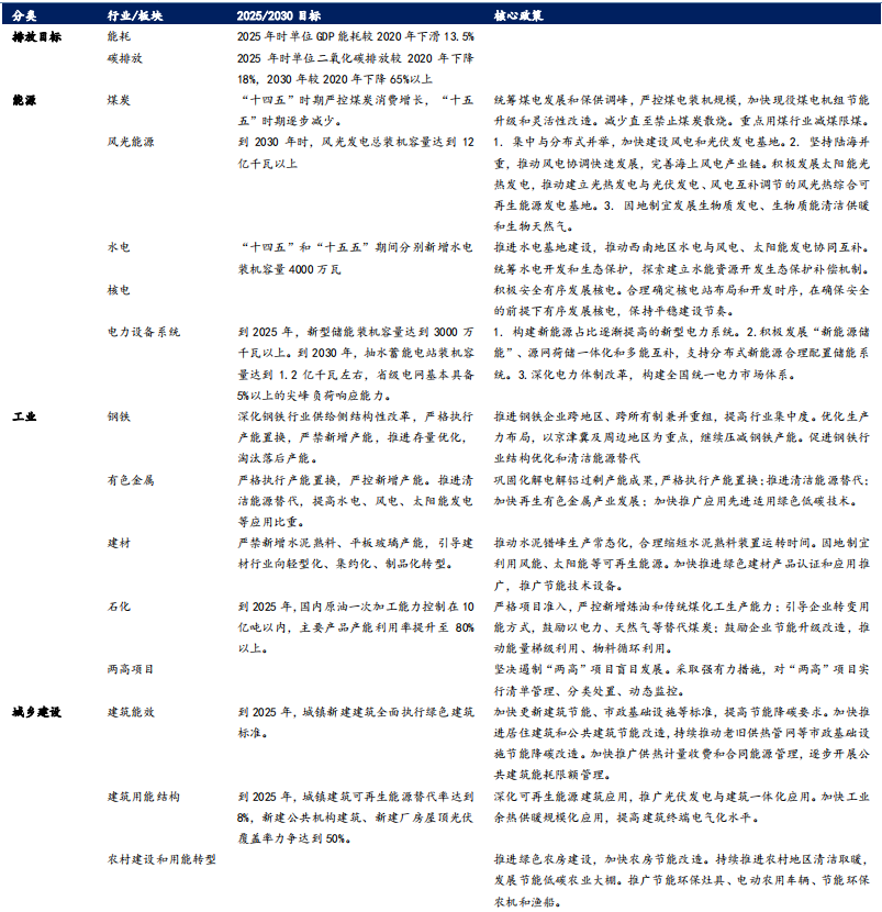 煤炭目标:“十四五”时期严控煤炭消费增长,“十五五”时期逐步减少。核心政策:统筹煤电发展和保供调峰,严控煤电装机规模,加快现役煤电机组节能升级和灵活性改造。减少直至禁止煤炭散烧。重点用煤行业减煤限煤。