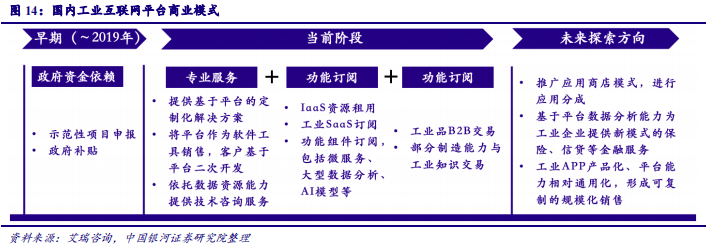 国内工业互联网平台早期较为依赖政府扶持,目前行业形成了“专业服务+订阅功能+在线交易”的商业模式。