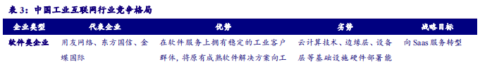 (1)软件企业:代表企业有用友网络、东方国信、金蝶国际等,将已有的成熟软件解决方案应用于工业领域,在软件服务上拥有稳定的工业客户群体,将原有成熟软件解决方案向工业领域延伸,成本较低,交付灵活,向Saas