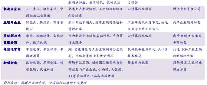 (3)互联网企业:代表企业有阿里云、腾讯云、BAT等,云计算技术领先,消费互联网经验和资源丰富等优势明显,但是工业知识较为缺乏,未来有望向产业互联网延伸;