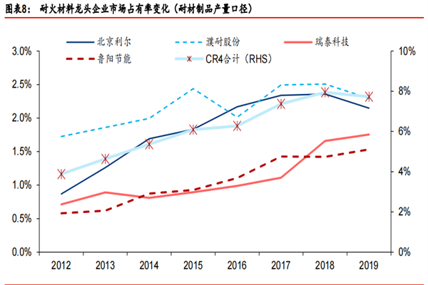 亿,其中73家重点耐材企业收入568亿,仅占27.4%,其中,行业CR4占比7.7%,与2012年相比提升了3.8个百分点,市占率持续提升。