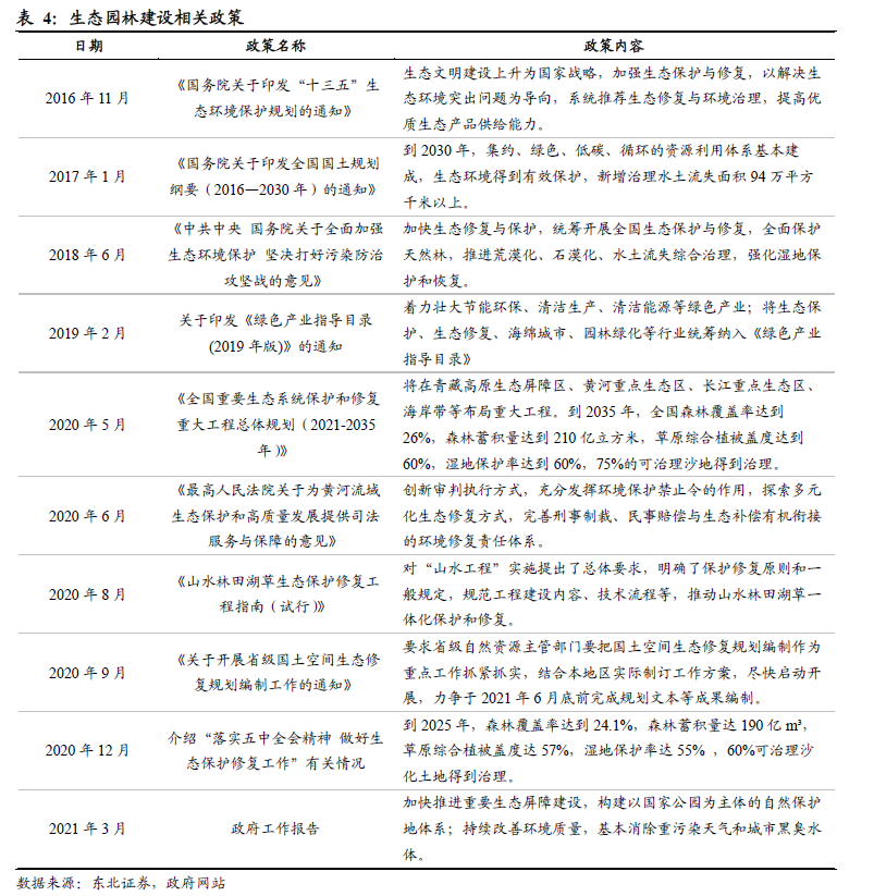 ![园林行业上市公司一览1. 蒙草生态公司拥有特色种业体系以及领先植物种质资源库,专注于生态修复业务,是国内较大规模的生态修复用种、草坪用种、观赏草用种专业供应商。目前研发投入持续加大,建立十多个专项生态研究机构,建立二百余项生态修复技术标准。聚焦于生态修复主营业务,大力发展创新业务。公司紧紧围绕主业生态修复和种业科技,中标多项重大工程。同时,2020年矿山修复业务取得了良好进展,与平煤集团、准能集团等大型业务建立了合作关系,先后承建了多个矿山修复项目。2.东珠生态着重发力生态修复与景观建设技术的研发,掌握生态修复领域核心技术。随着经济逐步恢复,公司业绩持续向好。截止2020年上半年,公司取得生态修复领域专利18项,园林绿化领域20项。同时,公司在长三角地区、粤港澳大湾区积极探索创新业务合作模式,未来有望为公司发展注入新动力。2020年5月,《全国重要生态系统保护和修复重大工程总体规划(2021-2035年)》提出将在长江、黄河等生态区布局重大工程。公司在生态湿地修复领域的先发优势及地理位置优势,将为业务承揽提供强支持。3.杭州园林公司参与多项国家重大项目,品牌形象良好。2017年,杭州园林开始从事风景园林工程总承包业务(EPC),涵盖了设计、采购和施工等环节,全面负责承包工程的质量、安全、工期、造价等。公司从事风景园林设计行业多年,参与西湖风景名胜区综合保护工程、“G20杭州峰会”、“厦门金砖国家领导人峰会”等核心景观设计, “杭州园林设计院”在全国享有一定的知名度,塑造了良好的品牌形象。4.岭南股份业务结构不断优化,进入发展“快车道”。岭南股份传统业务为景观规划设计、生态环境与园林建设、苗木培植与养护、生态环境修复等,于2014年上市。2017年,公司开始着力布局水务水环境治理业务,聚焦于水利工程、城乡水务、水环境水生态治理三大方面,2020年上半年,水务水环境治理业务实现营业收入14.45亿元,营收占比56.67%,同比增加16.87%。目前,公司已形成“水务水环境治理+生态环境修复+文化旅游”的业务格局,进入发展“快车道”。5.棕榈股份公司“一体两翼”,业务覆盖区域广阔。以“智慧城乡建设”业务为主体,以“生态城镇业务”和“创新业务平台”为两翼,并开始进行业务布局和协同发展。棕榈股份主要从事城镇及城市基础设施的规划设计、配套建设、生态环境治理、土壤修复、园林绿化工程施工和园林养护等业务。公司为包括迪士尼、华为、万科、保利等在内的传统商业客户以及政府客户,在中国以及全球创造各类经典作品超过1.5万余件,完成项目超过4500项,覆盖粤港澳大湾区、长三角、黄河流域、成渝城市群、长江中游城市、国家级新区等重点区域。生态园林建设相关政策2016年11月,《国务院关于印发“十三五”生态环境保护规划的通知》:生态文明建设上升为国家战略,加强生态保护与修复,以解决生态环境突出问题为导向,系统推荐生态修复与环境治理,提高优质生态产品供给能力。2017年1月,《国务院关于印发全国国土规划纲要(2016—2030年)的通知》:到2030年,集约、绿色、低碳、循环的资源利用体系基本建成,生态环境得到有效保护,新增治理水土流失面积94万平方千米以上。2018年6月,《中共中央国务院关于全面加强生态环境保护坚决打好污染防治攻坚战的意见》:加快生态修复与保护,统筹开展全国生态保护与修复,全面保护天然林,推进荒漠化、石漠化、水土流失综合治理,强化湿地保护和恢复。2019年2月,关于印发《绿色产业指导目录(2019年版)》的通知:着力壮大节能环保、清洁生产、清洁能源等绿色产业;将生态保护、生态修复、海绵城市、园林绿化等行业统筹纳入《绿色产业指导目录》2020年5月,《全国重要生态系统保护和修复重大工程总体规划(2021-2035年)》:将在青藏高原生态屏障区、黄河重点生态区、长江重点生态区、海岸带等布局重大工程。到2035年,全国森林覆盖率达到26%,森林蓄积量达到210亿立方米,草原综合植被盖度达到60%,湿地保护率达到60%,75%的可治理沙地得到治理。2020年6月,《最高人民法院关于为黄河流域生态保护和高质量发展提供司法服务与保障的意见》:创新审判执行方式,充分发挥环境保护禁止令的作用,探索多元化生态修复方式,完善刑事制裁、民事赔偿与生态补偿有机衔接的环境修复责任体系。2020年8月,《山水林田湖草生态保护修复工程指南(试行)》:对“山水工程”实施提出了总体要求,明确了保护修复原则和一般规定,规范工程建设内容、技术流程等,推动山水林田湖草一体化保护和修复。2020年9月,《关于开展省级国土空间生态修复规划编制工作的通知》:要求省级自然资源主管部门要把国土空间生态修复规划编制作为重点工作抓紧抓实,结合本地区实际制订工作方案,尽快启动开展,力争于2021年6月底前完成规划文本等成果编制。2020年12月,介绍“落实五中全会精神,做好生态保护修复工作”有关情况:到2025年,森林覆盖率达到24.1%,森林蓄积量达190亿m³,草原综合植被盖度达57%,湿地保护率达55%,60%可治理沙化土地得到治理。2021年3月,政府工作报告中提出:加快推进重要生态屏障建设,构建以国家公园为主体的自然保护地体系;持续改善环境质量,基本消除重污染天气和城市黑臭水体。内容来源:《【研报】园