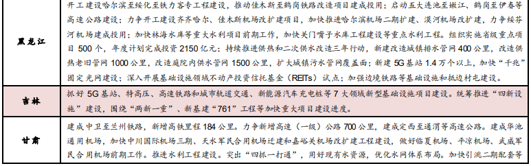 黑龙江:开工建设哈尔滨至绥化至铁力客专工程建设,推动佳木斯至鹤岗铁路改造项目建成投用;启动五大连池至嫩江、鹤岗至伊春等高速公路建设;力争开工建设齐齐哈尔、佳木斯机场改扩建项目,加快推进哈尔滨机场二期扩建、漠河机场改扩建,力争绥芬河机场建成投用;加快林海水库等重大水利项目前期工作,加快关门嘴子水库工程建设等重点水利工程。组织实施省级重点项目500个,年度计划完成投资2150亿元;持续推进供热和二次供水改造三年行动,新建改造城镇排水管网400公里,改造供热老旧管网1000公里,改造庭院内供水管网1500公里,扩大城镇污水管网覆盖面;新建5G基站1.4万个以上,加快“千兆”