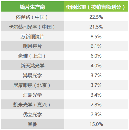 在这当中,依视路、卡尔蔡司光学的市场份额均超过了20%,市场份额分别为22.5%、21.5%,占据了市场前2的位置。而国产镜片的代表厂商万新眼镜片、明月镜片分别位居前三和前四位,市场份额分别为8.5%、6.1%。当前,国内眼镜镜片市场主要被国际知名品牌所占据,国内品牌较其具有一定的差距。