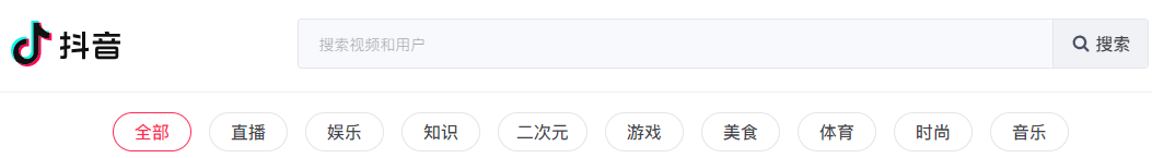 抖音网页版打开整体还是比较简单的,在顶部有抖音的标志,旁边是一个搜索框可以搜索视频和用户,在下面就是几个分区,分别是全部、直播、娱乐、知识、二次元、游戏、美食、体育、时尚、音乐,用户通过点击这些可以进入到自己喜欢的领域。