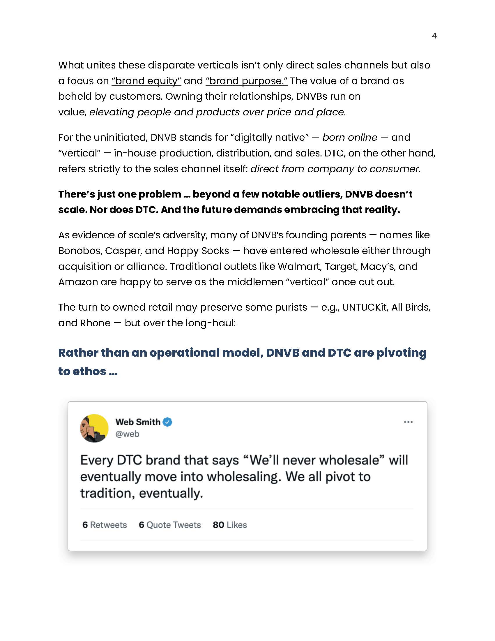 为了克服发展规模上的困难,传统DNVB正在超越DTC作为一种运营模式。相反,“直接”将越来越成为一种风气:一种营销和留住客户的方法,深植于一对一关系的价值和感受之中,但不再受制造和分销所有权的支配。此举有两种方式:从自下而上(DTC到批发)和自上而下(传统到DTC)。