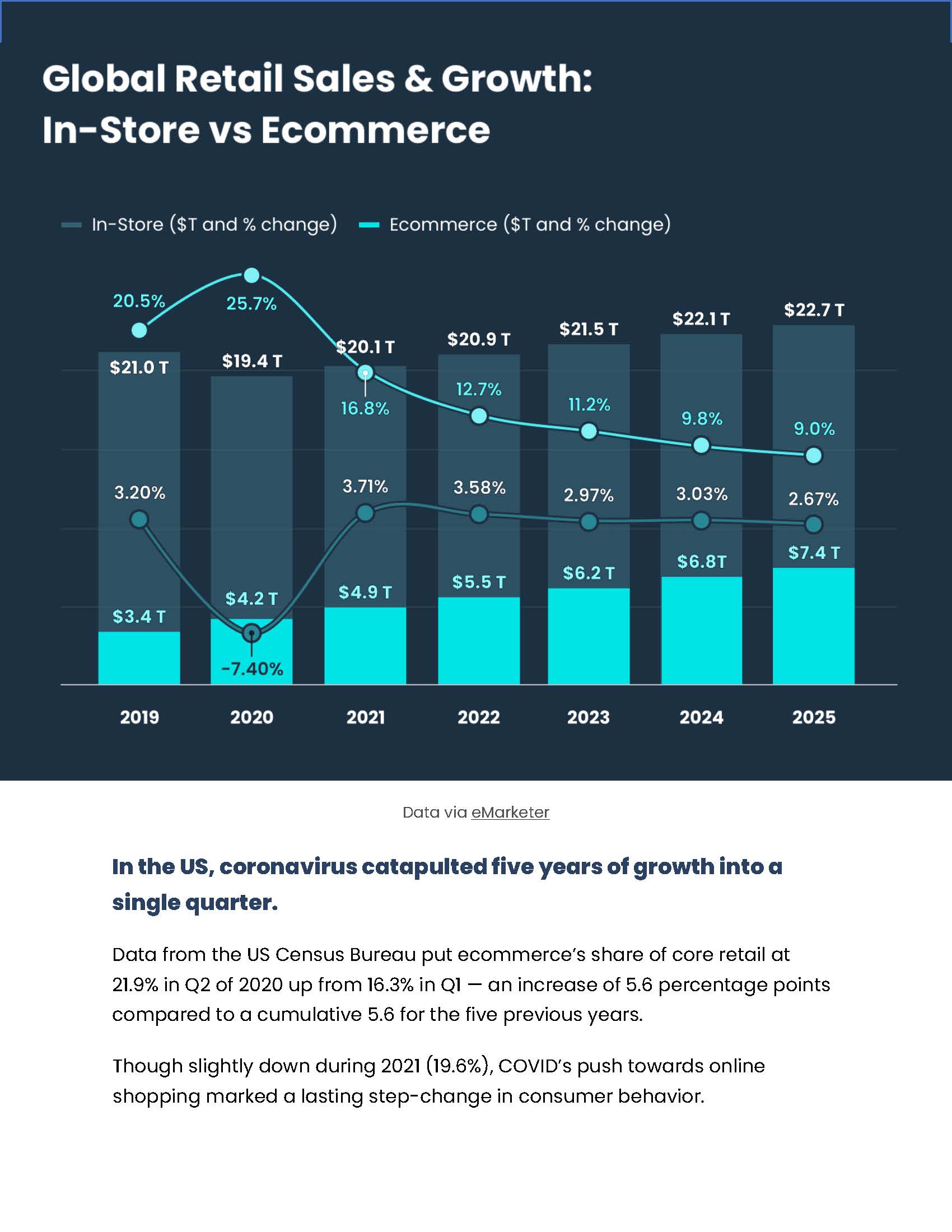 除开新的增长,店内零售额比在线销售额高出15.21万亿美元以上。尽管新冠疫情加速了电子商务的采用,但实体店的反弹也非常迅速。