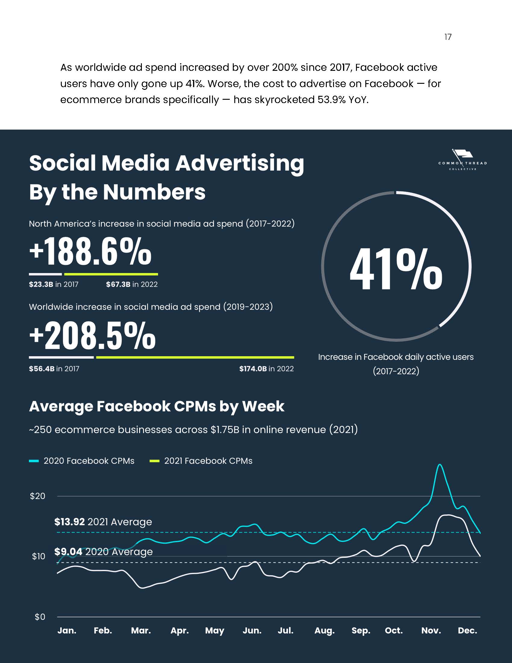 自2017年以来,全球广告支出增长了200%以上,而Facebook活跃用户只增长了41%。更糟糕的是,在Facebook上做广告的成本,尤其是电商品牌,同比飙升了53.9%。