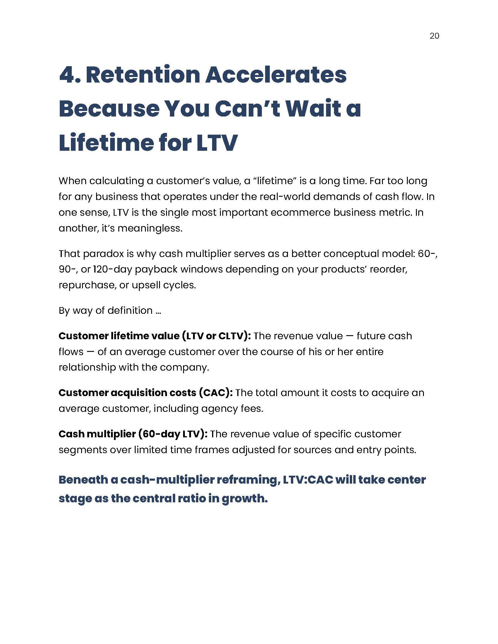 这一悖论就是为什么现金乘数可以作为更好的概念模型的原因:60天、90天或120天的回报窗口,取决于产品的再订购、回购或追加销售周期。
