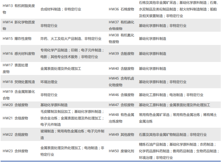 据2019年《国家危险废物名录》(修订版),危废有医疗废物;医疗废物;废药品、药品农药废物;木材防腐剂废物;废有机溶剂与含有机溶剂废物;热处理含氰废物;废矿物油与含矿物油废物;油/水、烂/水混合物或乳化液;多氯(溴)联;精(蒸)馏残渣;染料、涂料废物;有机树脂类废物;新化学物质废物;爆炸性废物;感光材料废物;表面处理废物;焚烧处置残渣;含金属羰基化合物;含镀废物;含铬废物;含铜废物;含锌废物;含砷废物;含硒废物;含镉废物;含碲废物;含汞废物;含铊废物;含铅废物;无机氟化;无机氰化废物;无机氟化废物;废酸;废碱;石棉废物;有机磷化合物废物;有机氰化物废物;含酚废物;含醚废物;含有机卤化物废物;含酚废物;含醚废物;含有机卤化物废物;含镍废物;含钡废物;有色金属冶炼废物;其他废物;废催化剂。