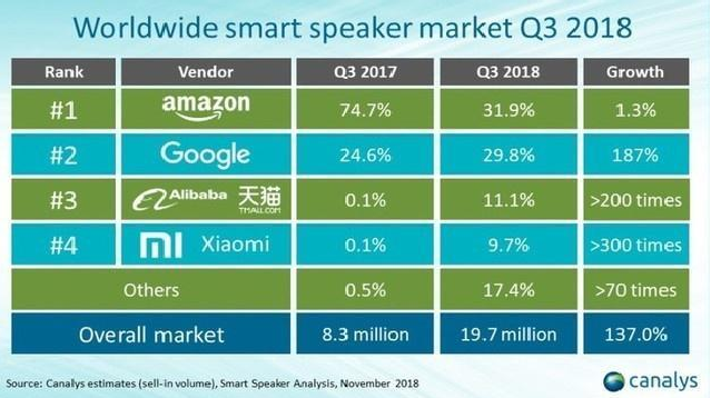 从全球市场看,市场调研机构Canalys发布的《2018年Q3全球智能音响市场调查报告》数据显示:智能音箱在2018年第三季度的全球出货量超过1970万部,同比增长137%。其中,亚马逊市场份额排名第一,谷歌、阿里及小米分列第二、第三及第四。