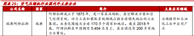 瑞典阿特拉斯:阿特拉斯成立于 1873 年,是一家在压缩机、真空解决方案和空气处理系统、动力工具和装配系统领域占据全球领先地位的工业集团。业务范围遍及全球 170 多个国家和地区。截至 2018 年底,阿特拉斯在中国拥有