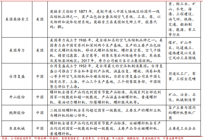 英格索兰:1871 年成立,很早就已经进入中国大陆地区,其产品包括全套压缩空气系统、工具、泵,以及物料和流体处理系统。