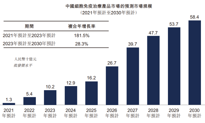 预计2021-2023年,中国的细胞免疫治疗产品市场规模将由13亿上升到102亿元,复合年增长率达181.5%,并且将于2030年达到584亿元,其中2023年至2030年的复合年增长率为28.3%。