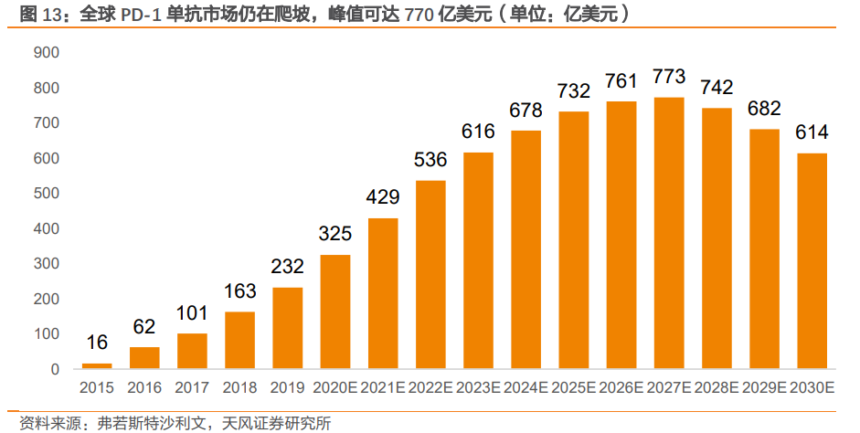 全球PD-1 单抗市场仍在爬坡,峰值可达 770 亿美元(单位:亿美元)