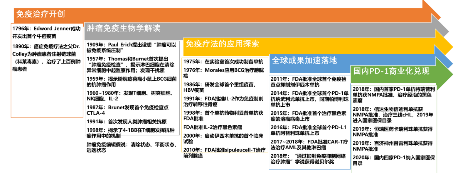 1957年,Thomas和Burnet首次提出“肿瘤免疫检查”,揭示淋巴细胞在清除异常细胞中起监察作用,发现干扰素。