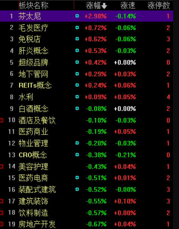 板块方面,涨幅位居前列的板块有芬太尼、免税店、肝炎、超级品牌等,跌幅位居前列的板块有纺织服装、煤炭、证券、次新股等。