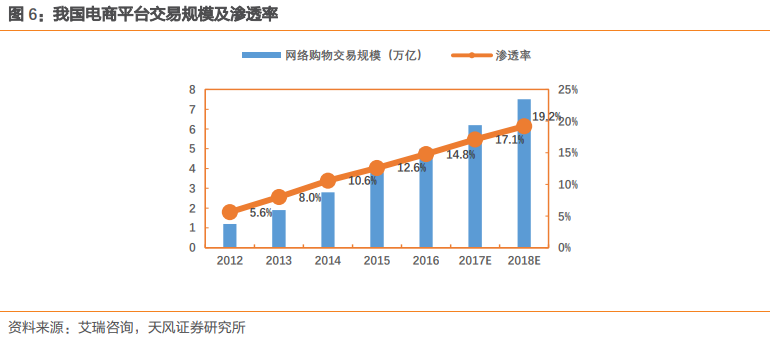 2016年中国电子商务市场交易规模约为5万亿,2012-2016年的年均增速约为42.8%。就鲜花电商方面来看,2015年,阿里平台上完成的农产品销售总额为695.50亿元,其中,鲜花、绿植、园艺的销售总额约为50亿元,占比为7.13%,在这当中,鲜切花销售总额约为15亿元,对应的鲜花电商渗透率为15/217=6.9%,渗透率较低。而据艾瑞咨询数据,2015年,中国的网络购物渗透率已经达到了12.6%,就此来看,我国鲜花电商存在较大渗透空间。
