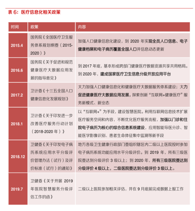 早在2009年,新医改政策公布开始,众多部门开始制定和发布与医疗信息化相关的政策。卫生部“十二五”规划明确提出卫生信息化是深化医疗改革的重要任务。卫生部初步确定了中国医疗信息化建设的路线图,简称“3521工程”,即建设国家级、省级和地市级三级卫生信息平台,加强公共卫生、医疗服务、新农合、基本药物制度、综合管理5项业务应用,建设健康档案和电子病历2个基础数据库和1个专用网络建设。2015年《全国医疗卫生服务体系规划纲要(2015-2020年)》《国务院办公厅关于推进分级诊疗制度建设的指导意见》《国务院关于积极推进“互联网+”行动的指导意见》,分级诊疗、医联体、全面改善医疗服务计划等医疗健康行业政策的高频出台,明确市场了对医疗信息化的需求