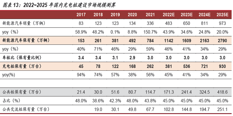 随着新能源汽车渗透率提升速度超过预期,预计未来将持续扩张。建设端按3:1车桩产出,预计到2025年中国充电桩保有量有望达到930万台,2022-2025年CAGR约为37.3%;由此可见,预计到2025年中国充电桩市场规模有望达1678亿元。