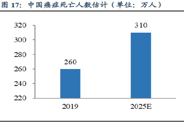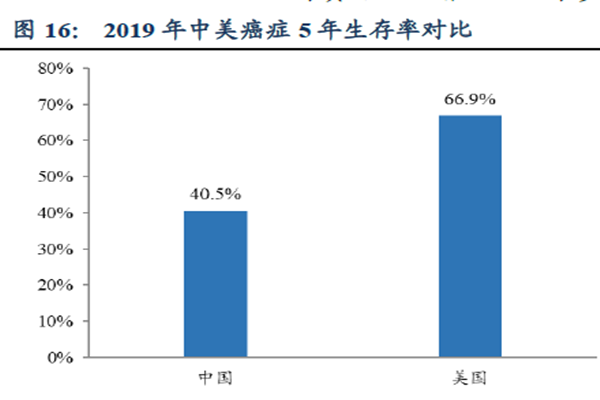 从生存率上来看,2015-2019年中国癌症死亡人数由230万人增长到260万人。预计到2025年中国癌症死亡人数将达到310万人。与美国癌症患者5年的生存率相比较低,中国的40.5%低于美国的66.9%。
