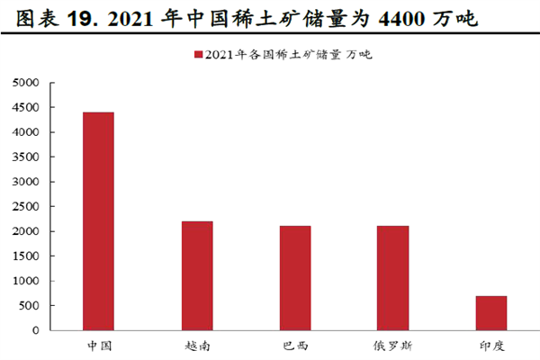 随着稀土价格指数大幅度提升,需求不断增加,截止到2021年底,据数据统计,我国稀土矿储量达到了4400万吨,储量排名第一,占全球储量的36.7%。除中国外,稀土矿较为丰富的国家排行依次为越南、巴西、俄罗斯和印度,2021年稀土矿储量分别为2200万吨、2100万吨、2100万吨和690万吨,占比分别为18%、18%、18%和6%。