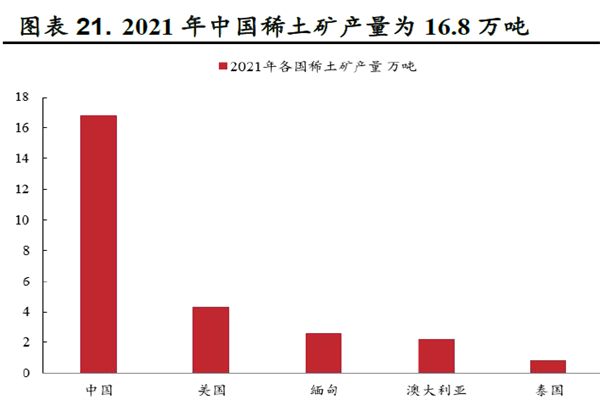 从产量方面来看,截止到2021年底,中国是稀土产量达到16.8万吨,产量排名第一,占全球总产量的60%,成为稀土矿第一产量大国。此外,全球其他稀土矿产量大国依次为美国、缅甸、澳大利亚和泰国,2021年稀土矿产量分别为4.3万吨、2.6万吨、2.2万吨和0.8万吨,占比分别为15%、9%、8%和3%。