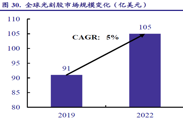 据数据统计,2019年全球光刻胶市场规模达到了9亿美元,预计到2022年全球光刻胶市场规模约为105亿美元,2019-2022年CAGR约为5%。从结构占比来看,半导体挂个科教占比最高,为27%;LCD和PCB光刻胶占比均为24%。