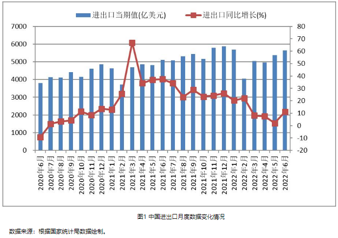 按人民币计算,2022年1至6月我国进出口总额为198021.8亿元人民币,同比增长9.4%。其中,出口111416.7亿元,同比增长13.2%;进口86605.1亿元,同比增长4.8%;贸易顺差24811.6亿元。6月份当月,我国进出口总额3.77万亿元,同比增长14.3%,环比上升9.3%。其中,出口2.21万亿元,同比增长22.0%,环比上升11.9%;进口1.56万亿元,同比增长4.8%,环比上升5.8%;贸易顺差6501.1亿元,同比增加95.4%。