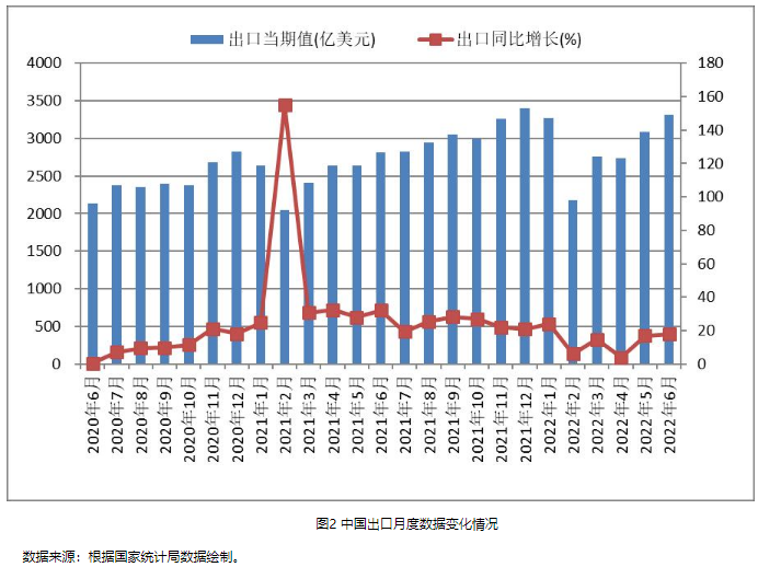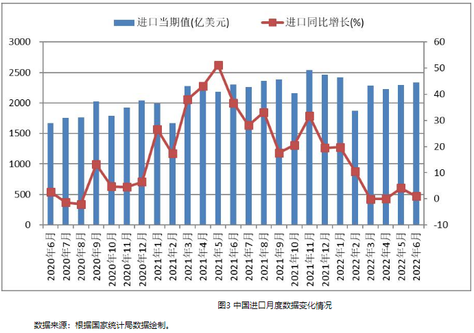根据海关统计数据,2022年1至6月份,我国外贸进出口总额为30791.2亿美元,同比增长10.3%。其中,出口为17322.8亿美元,同比增长14.2%;进口为13468.4亿美元,同比增长5.7%,贸易差额为3854.4亿美元。6月份当月,我国外贸进出口总额5645.9亿美元,同比增长10.3%,当月环比增长8.4%,相比上月下降3.3个百分比。其中,出口3312.6亿美元,同比增长17.9%,当月环比增长7.7%,相比上月下降4.9个百分比;进口2333.2亿美元,同比增长1.0%,当月环比增长1.7%,相比上月下降2.4个百分比;贸易差额979.4亿美元。从图1-图3也可以看出,6月份我国进出口总额仍维持增长趋势,出口总额增长较为平稳,但进口总额增长呈下降趋势。