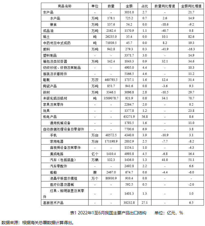 亿元,大幅增长11.0%,当月环比上升7.3%;集成电路出口额4993.8亿元,大幅增长16.4%,当月环比上升10.3%;汽车出口额1436.0亿元,大幅增长51.1%,但当月环比下降6.3%。自动数据处理设备增长3.8%,当月环比上升29.9%;音视频设备及其零件负增长4.3%,当月环比上升13.0%;灯具、照明装置及其零件增长1.0%,当月环比上升12.6%;医疗仪器及器械负增长2.0%,当月环比上升14.3%。船舶负增长6.0%,但当月环比大幅度上升115.3%。而汽车(包括底盘)出口额1436.0亿元,同比增长大幅上升51.1%,但增速存在下降压力,当月环比下降6.3%;家用电器出口量下降7.7%,出口额下降8.2%,且当月环比下降1.3%。此外,手机出口量虽然继续大幅度下降10.9%,但出口额增长3.1%。二是高新技术产品总体来看稳健增长。其总出口额达到30232.8亿元,增长6.5%,占出口比重为27.1%,当月环比大幅上升13.2%。三是部分劳动密集型产品(包括箱包、鞋靴、玩具、服装等)的出口额与出口量保持了较高增速,且增速有上升趋势。其中,箱包及类似容器、鞋靴、玩具、服装等的出口额增速较高,且增速上升趋势明显。箱包及类似容器出口量增长32.1%,出口额增长34.6%,出口额达到1043.3亿元,当月环比上升11.3%;鞋靴出口额1737.1亿元,增长31.4%,出口量增长12.4%,且当月环比上升17.8%;玩具出口额1377.8亿元,增长23.8%,当月环比上升18.4%;服装及衣着附件出口额增长11.2%,同月环比上升23.7%。此外,家具及其零件小幅上升0.2%,同月环比小幅上升1.3%;陶瓷产品出口额增长9.3%,同月环比增长10.7%,但出口量下降3.6%。四是受益于需求与价格因素,稀土和未锻轧铝及铝材等出口量与出口额增长较快,但增长上升趋势减缓。其中稀土出口量增长10.1%,出口额大幅度增长82.6%,当月环比下降33.9%;未锻轧铝及铝材出口量增长34.1%,出口额增长大幅度增长70.7%,当月环比下降7.5%。其他如钢铁相关产品的增速也较快,钢材虽然出口量下降10.5%,但出口额大幅增长29.7%,当月环比增长13.1%。