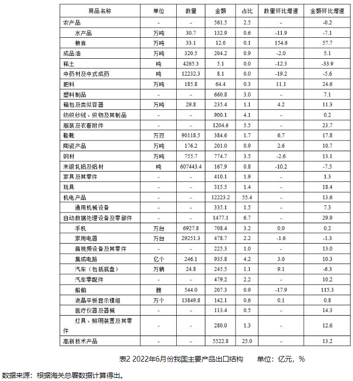 第一,就出口来看,2022年1至6月我国大部分主要产品的出口额继续保持增长趋势,但是也有部分机电产品的出口额增速呈下降态势,而且许多产品的出口数量呈下降态势(见表1)。6月份当月,出口形势继续回暖,大部分主要产品的出口额环比上升,但是出口量环比上升幅度非常微弱,部分产品环比下降(见表2)。具体来看:
