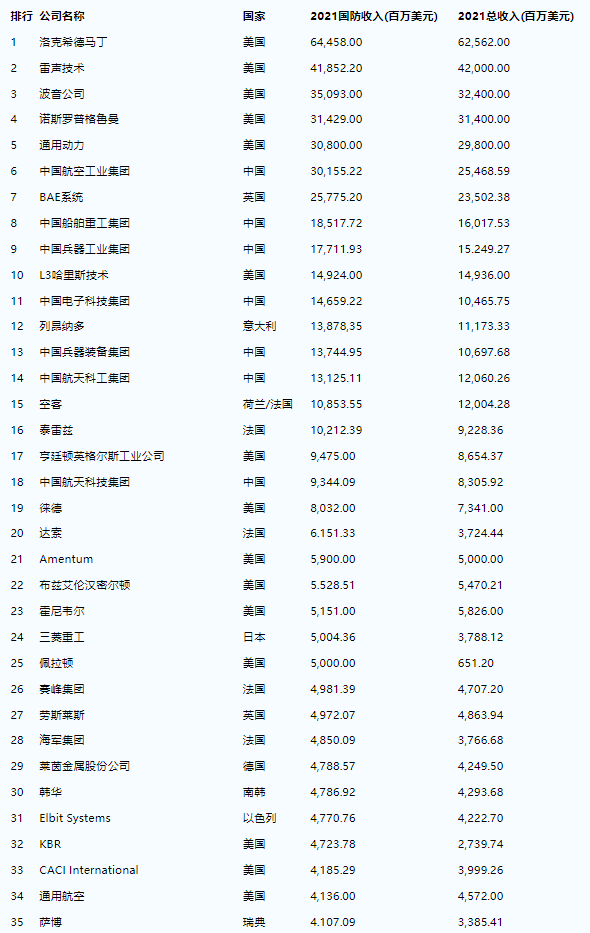 此前美国国防新闻网发布“2022年度全球防务百强榜”(2022世界军工企业100强),据榜单,位列前十的企业分别为洛克希德马丁、雷声技术、波音公司、诺斯罗普格鲁曼、通用动力、中国航空工业集团、BAE系统、中国船舶重工集团、中国兵器工业集团、L3哈里斯技术。
